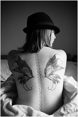 Women back star tattoo base of neck to the bottom of the wing